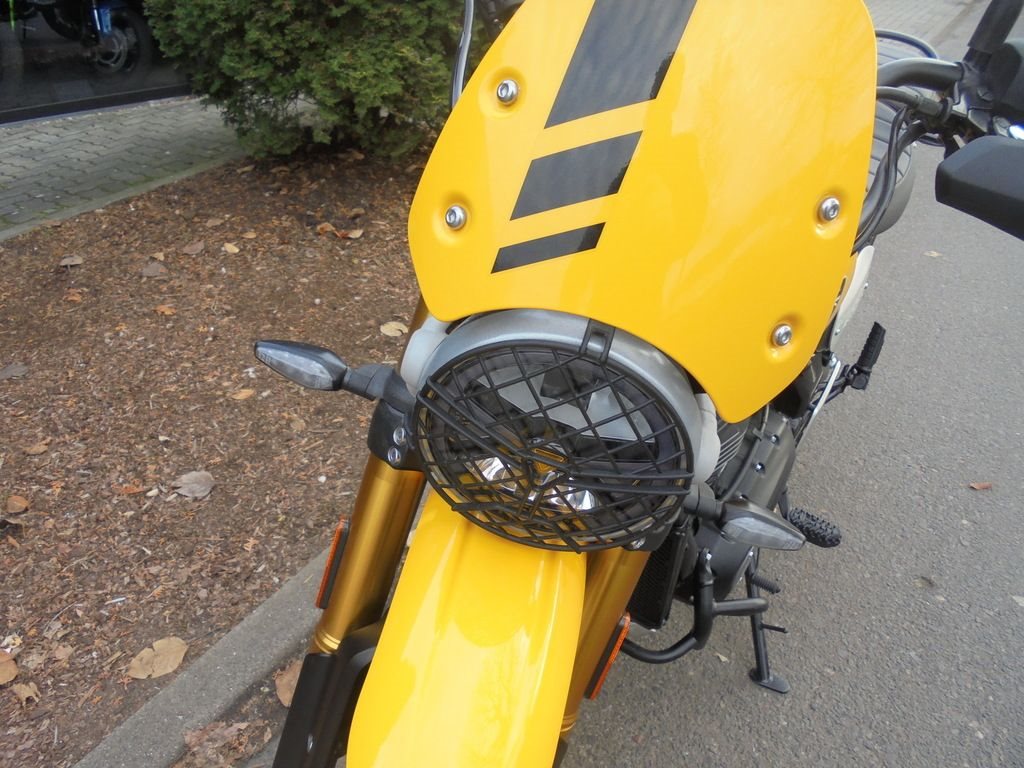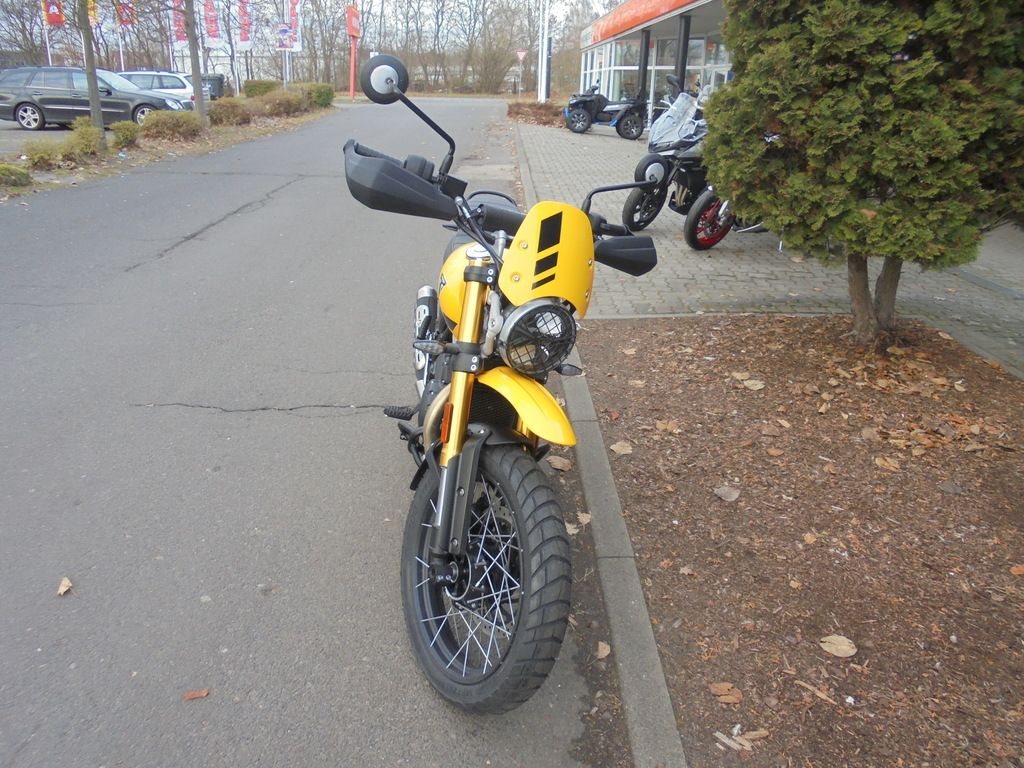 - Klassisches Scrambler-Design mit hoher Lenkerposition und schmalem Tank